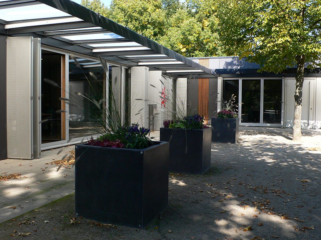 Diese Pavillons waren 1987 als temporäre Aufbauten im Rahmen der Bundesgartenschau entstanden und dienten als „Service-Center“ mit kleiner Ausstellungshalle, Japan-Restaurant und kleinen Läden. Ohne Wärmedämmung, Wetterschutz und haustechnische Infrastrukturen versehen waren diese Gebäude nur für ein Halbjahr konzipiert.