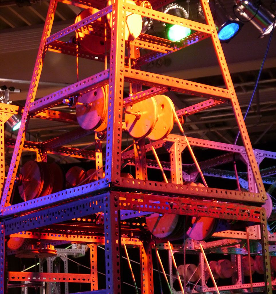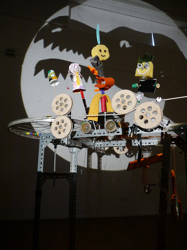 Die Lust an Mechanik wird geweckt. Kopf und Hand begreifen praktisch, wie es funktioniert, denn die Technik mit Räderwerk und Hebeln ist anschaulich und nachvollziehbar. Sobald sich jemand in die Pedale legt oder an der Kurbel dreht, setzt sich das ganze, große Ding mit Getöse und Gerappel in Bewegung. Diese Lichtmaschinerie stellt nichts her, aber bietet viel fürs Auge und fürs Ohr.