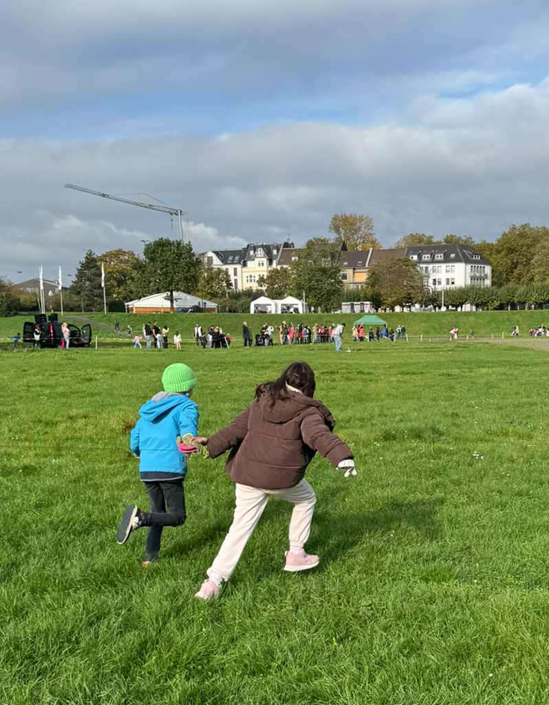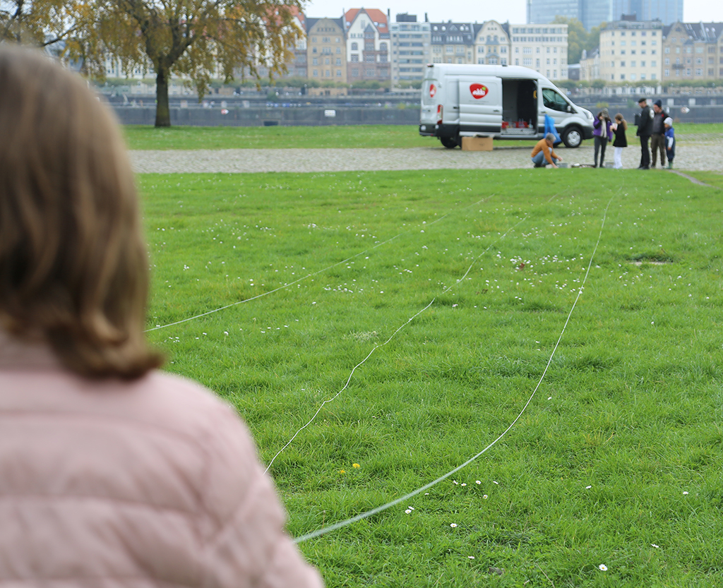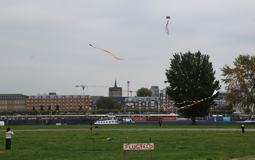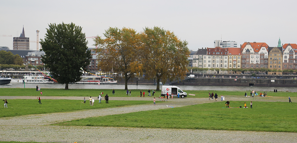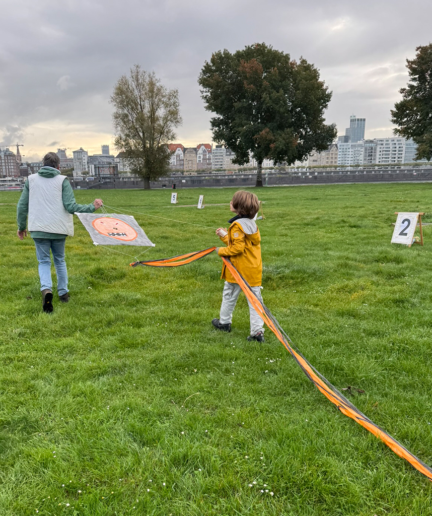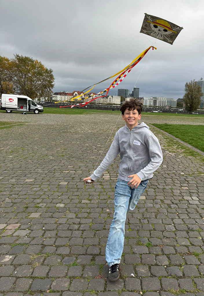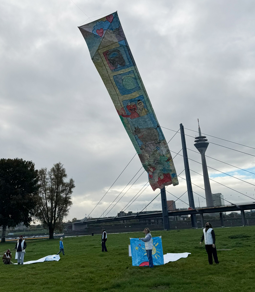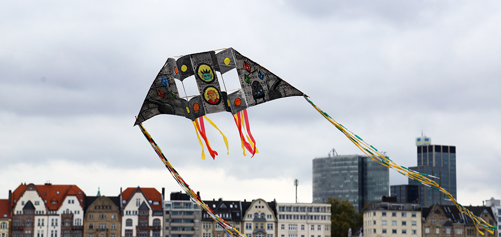 In der ersten Herbstferienwoche 2025 haben über 600 Kinder, Familien und OGS-Gruppen unsere Werkstattangebote auf der Oberkasseler Rheinwiese genutzt, um kleine Drachen und Himmelsriesen zu gestalten und vor der Düsseldorfer Skyline am Rhein unter fachkundiger Anleitung steigen zu lassen.