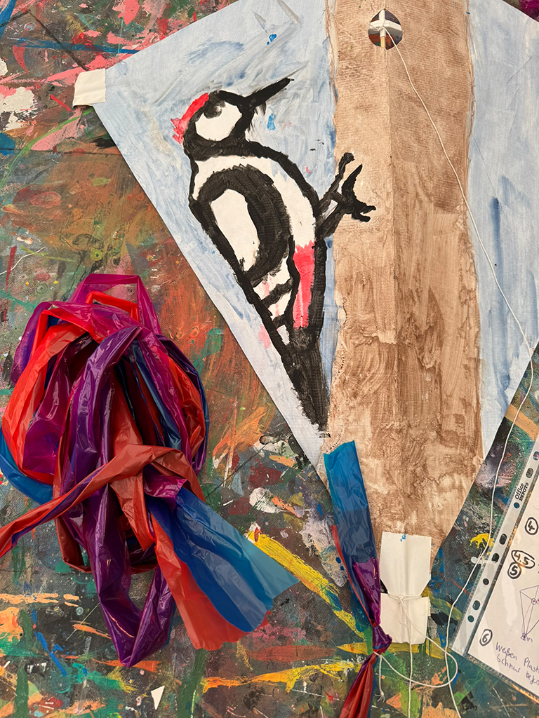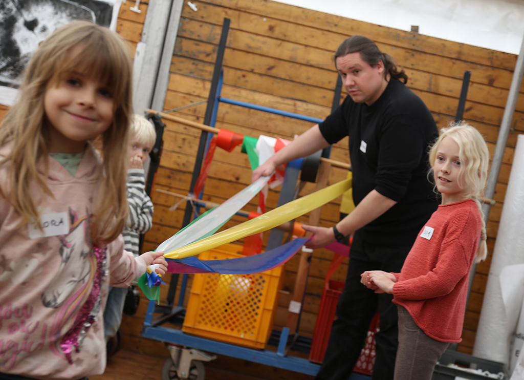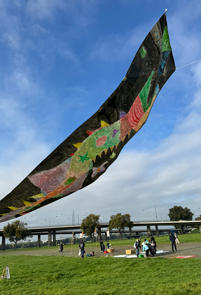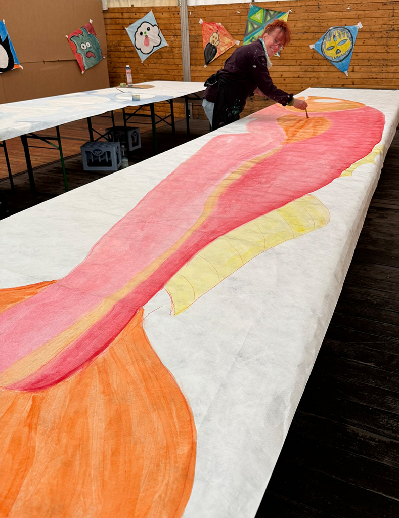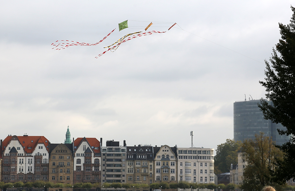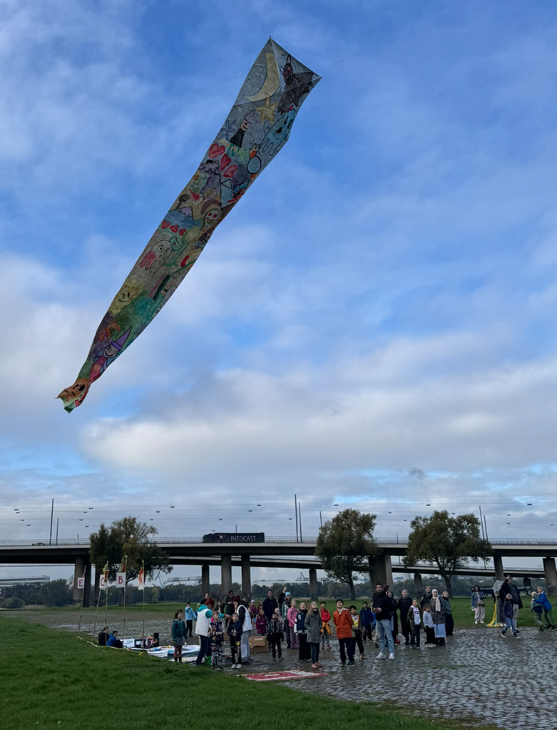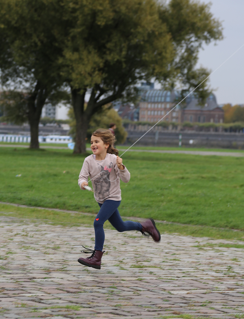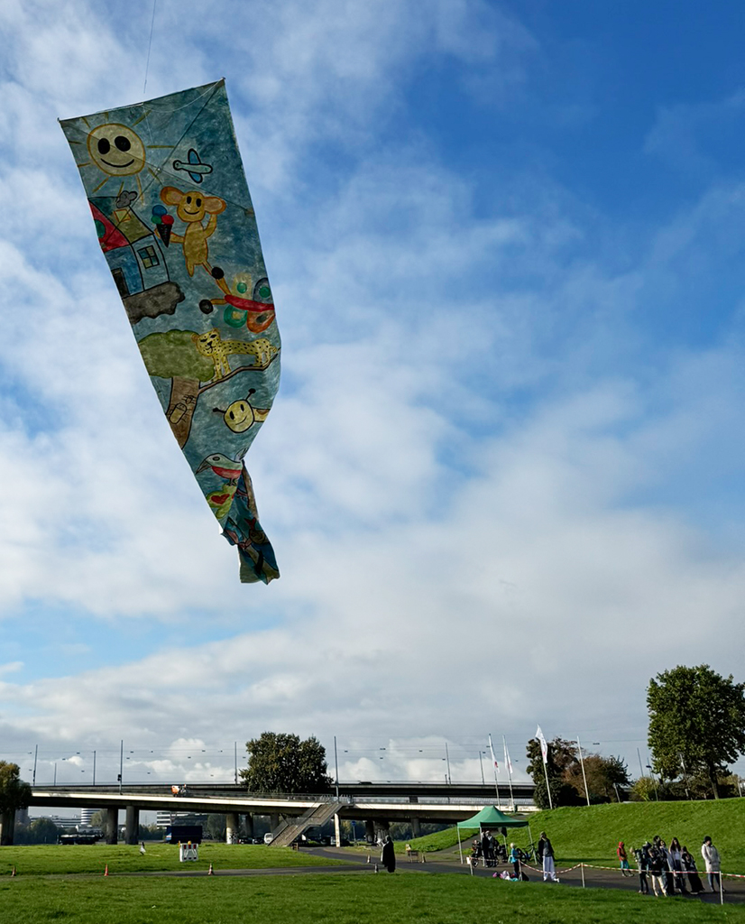In der ersten Herbstferienwoche 2025 haben über 600 Kinder, Familien und OGS-Gruppen unsere Werkstattangebote auf der Oberkasseler Rheinwiese genutzt, um kleine Drachen und Himmelsriesen zu gestalten und vor der Düsseldorfer Skyline am Rhein unter fachkundiger Anleitung steigen zu lassen.