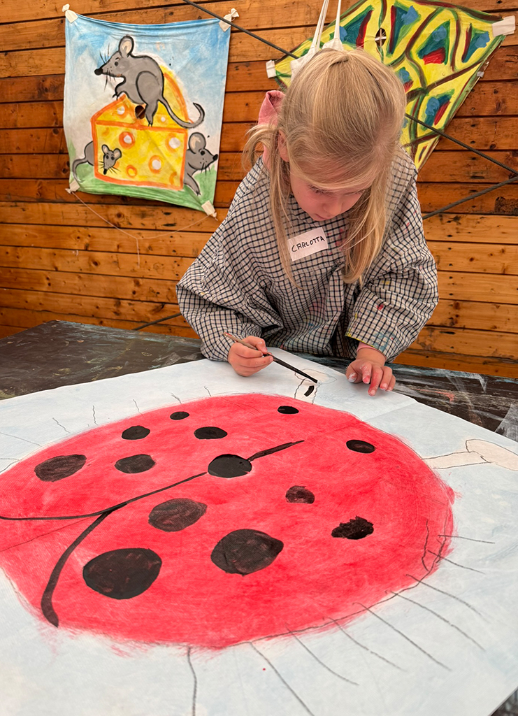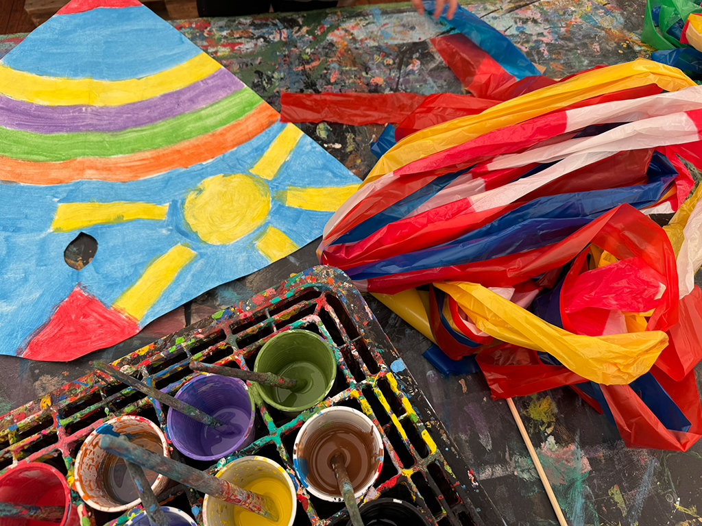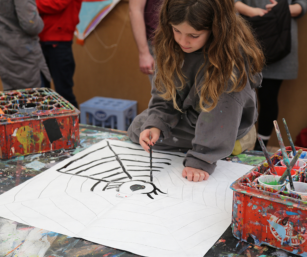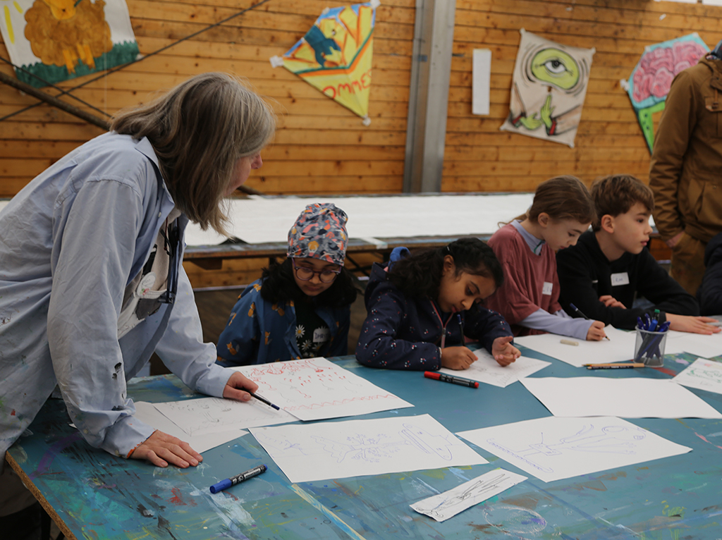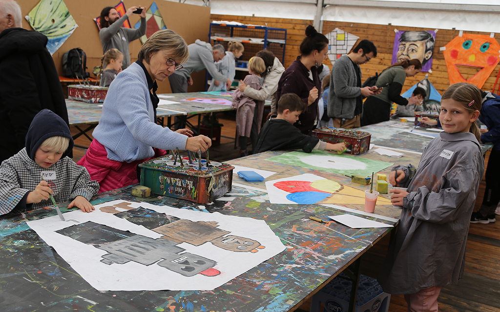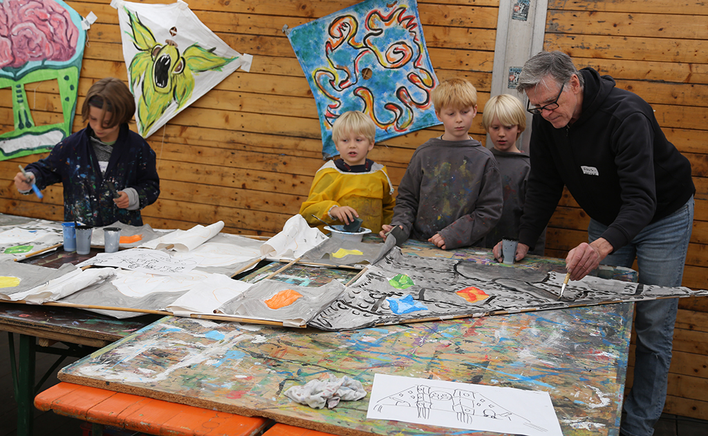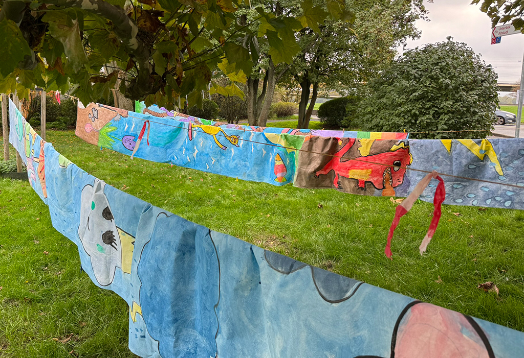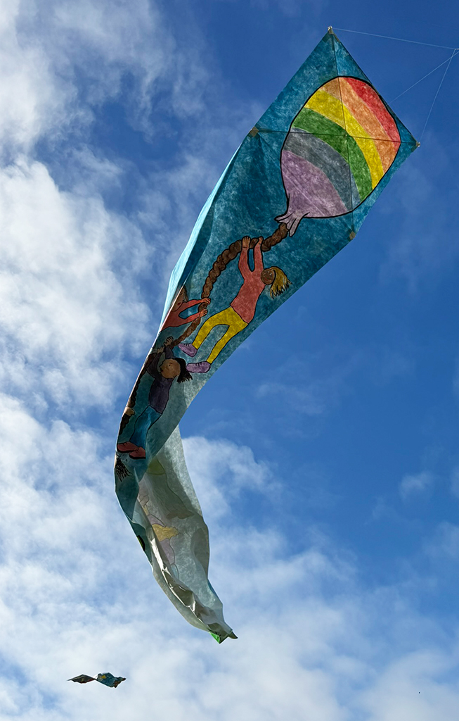 In der ersten Herbstferienwoche 2025 haben über 600 Kinder, Familien und OGS-Gruppen unsere Werkstattangebote auf der Oberkasseler Rheinwiese genutzt, um kleine Drachen und Himmelsriesen zu gestalten und vor der Düsseldorfer Skyline am Rhein unter fachkundiger Anleitung steigen zu lassen.