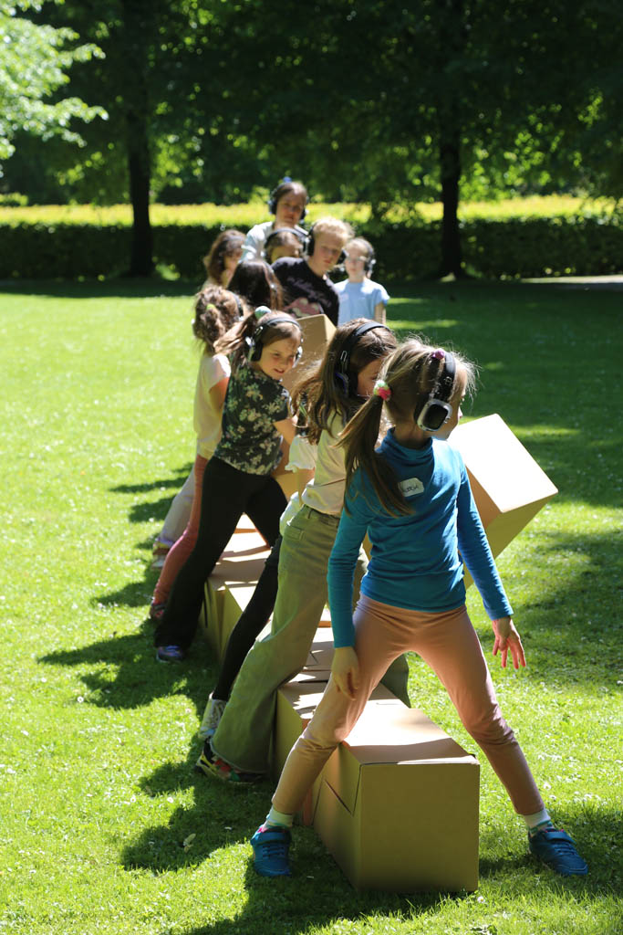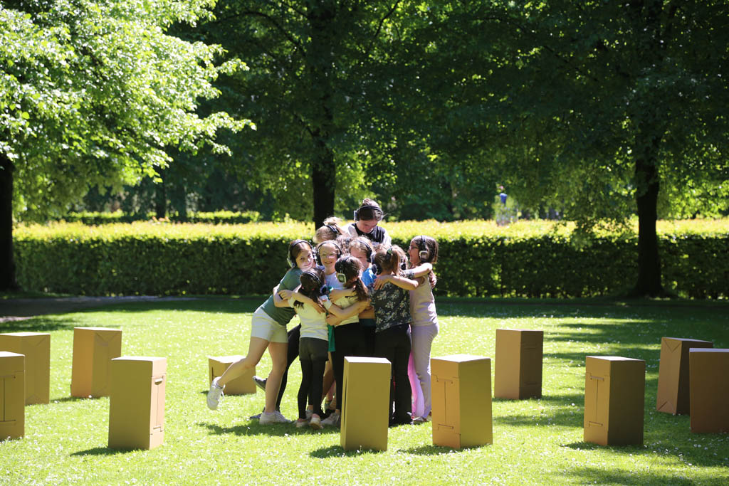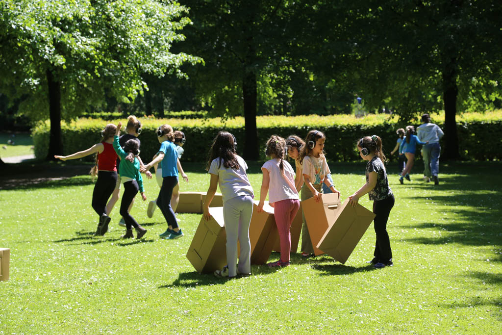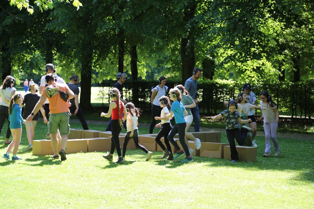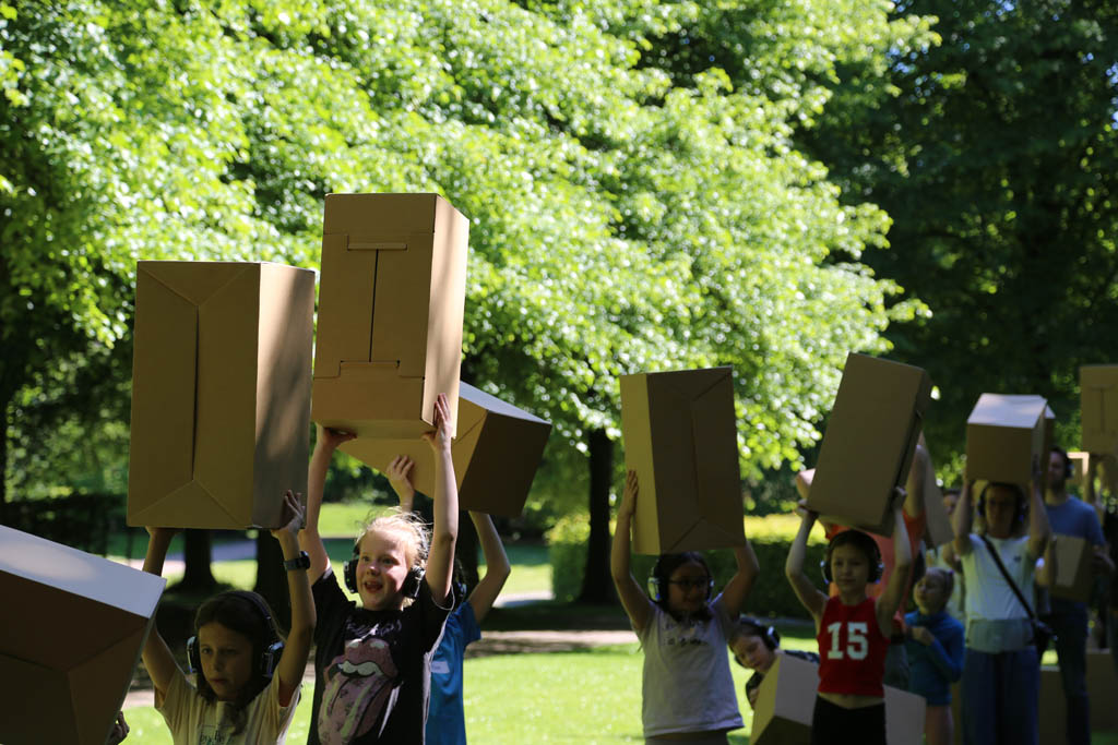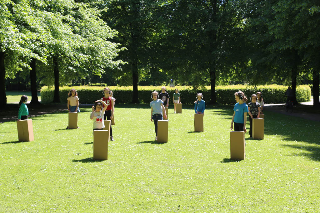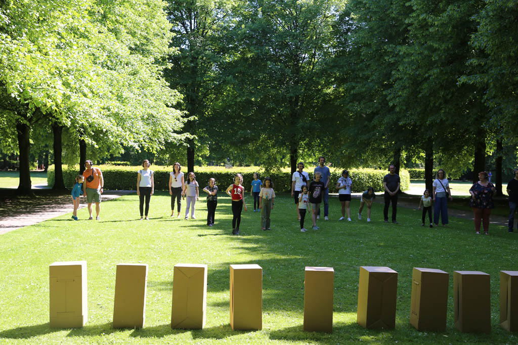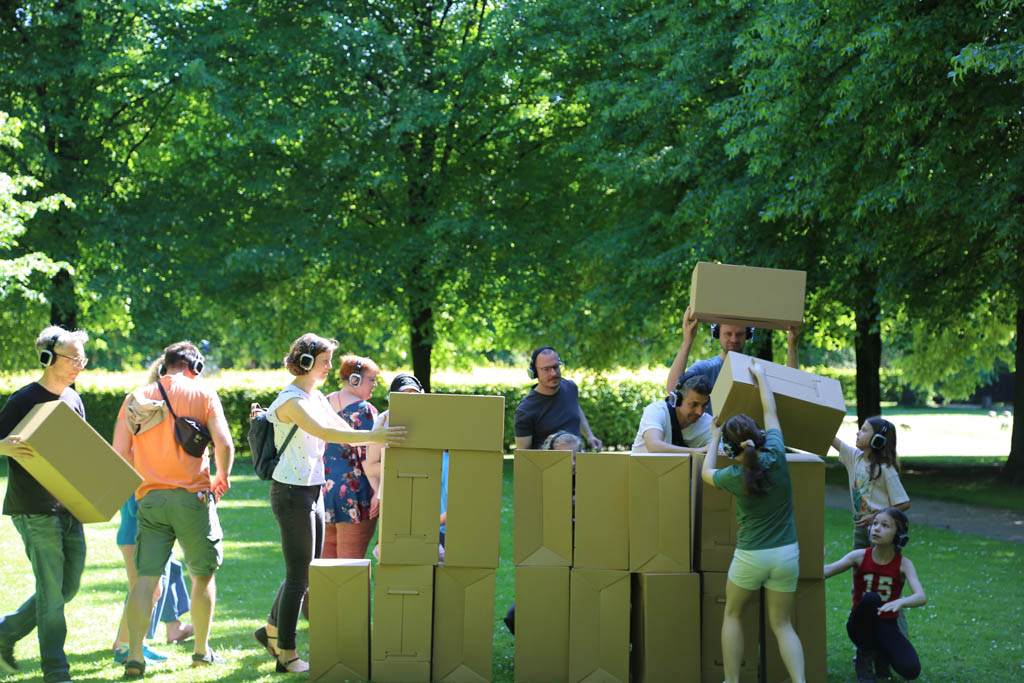 13 Teilnehmer*innen ab 7 Jahren haben im Workshop wird mit Kartons gespielt und mit Bewegungen experimentiert. Es sind lebendige Bilder entstanden und die Teilnehmenden wurden zum Kunstwerk, welches sich verändert und bewegt. Anweisungen über Kopfhörer lenkten die Performer*innen (“Bildet einen Kreis, Blick nach oben, Blick nach unten, Arme zum Himmel strecken”) und sorgten beim Publikum im Park für Irritationen. So war es gleichermaßen spannend mitzumachen oder zuzuschauen.