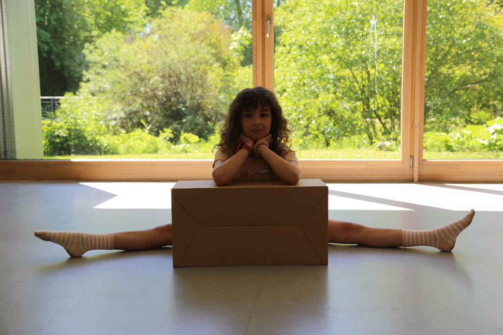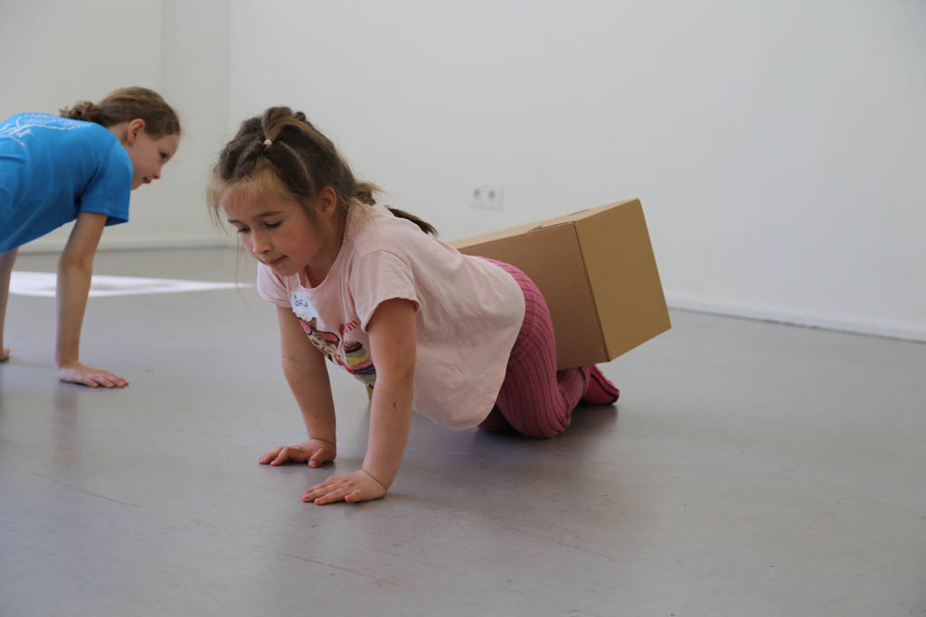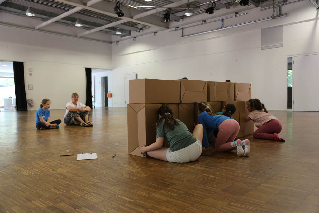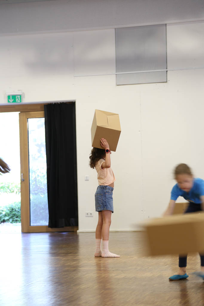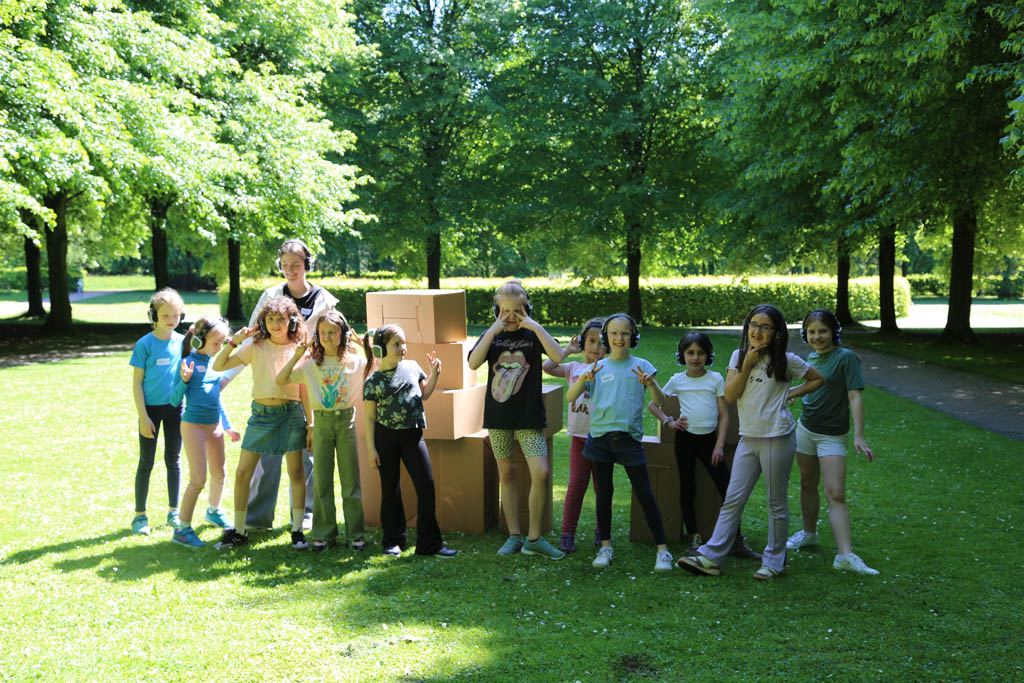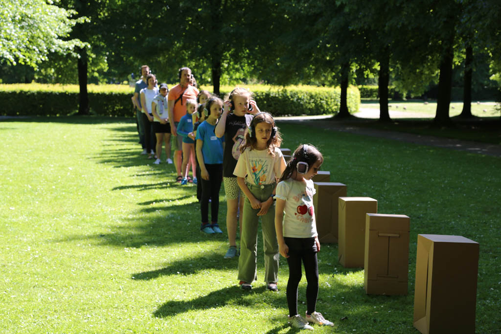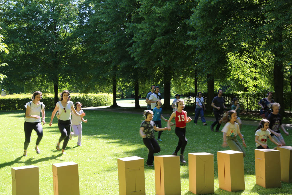13 Teilnehmer*innen ab 7 Jahren haben im Workshop wird mit Kartons gespielt und mit Bewegungen experimentiert. Es sind lebendige Bilder entstanden und die Teilnehmenden wurden zum Kunstwerk, welches sich verändert und bewegt. Anweisungen über Kopfhörer lenkten die Performer*innen (“Bildet einen Kreis, Blick nach oben, Blick nach unten, Arme zum Himmel strecken”) und sorgten beim Publikum im Park für Irritationen. So war es gleichermaßen spannend mitzumachen oder zuzuschauen.