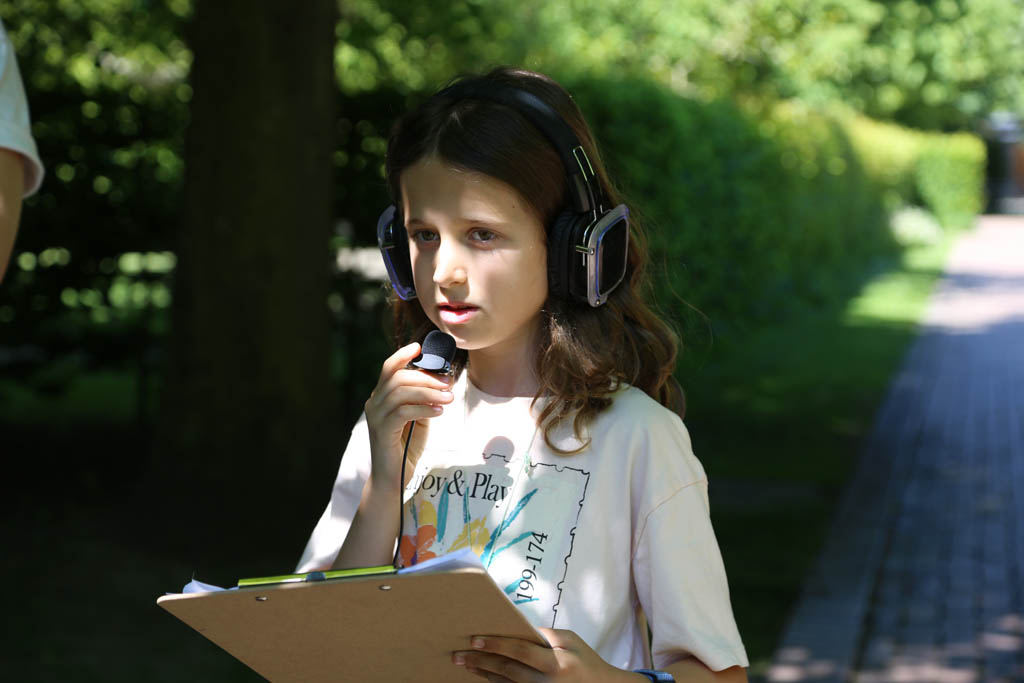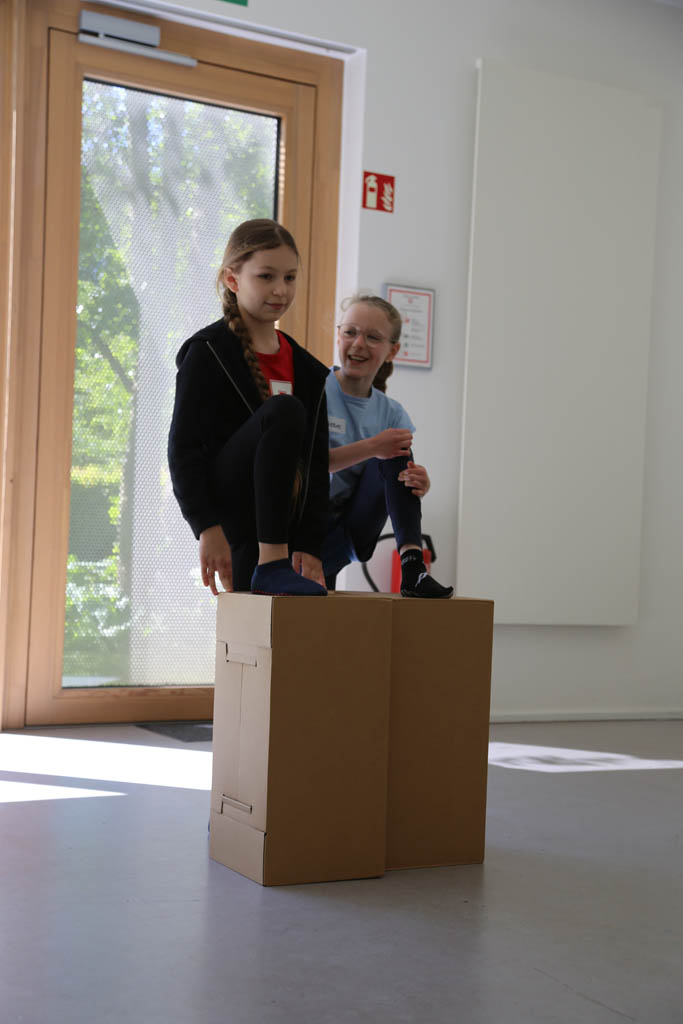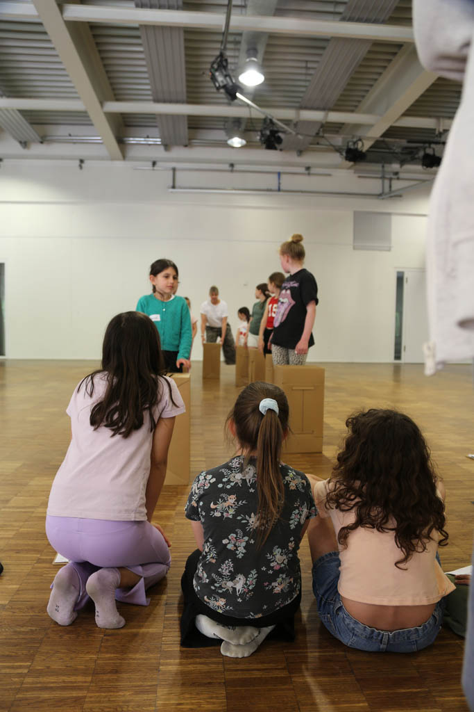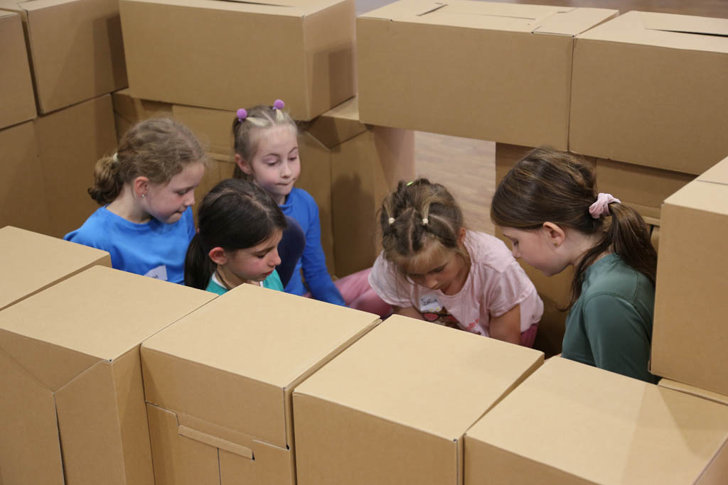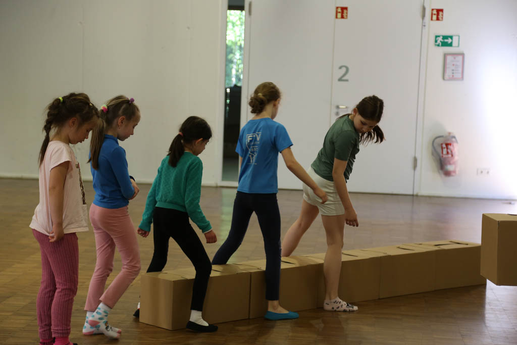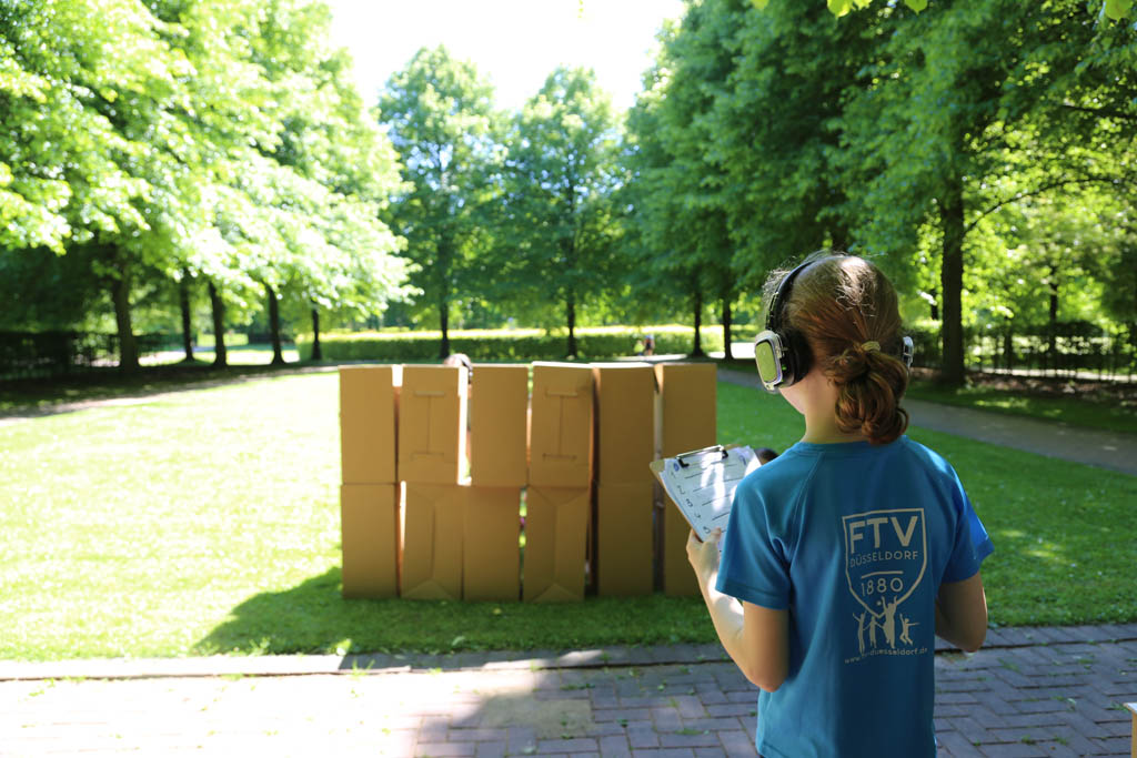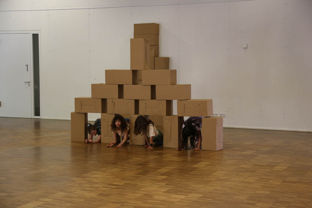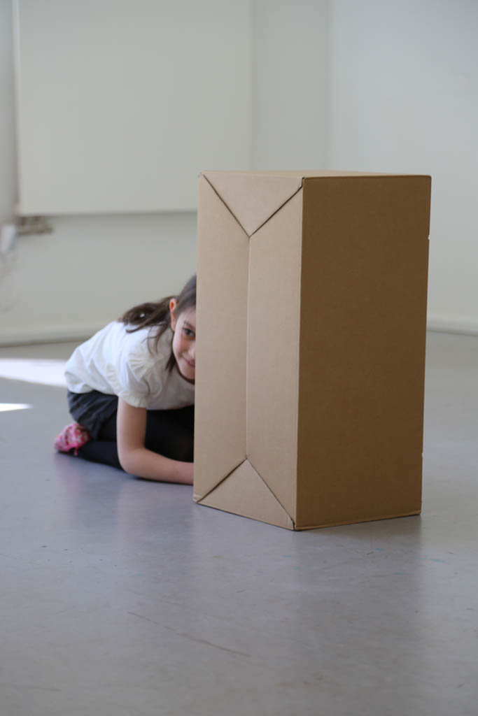 13 Teilnehmer*innen ab 7 Jahren haben im Workshop wird mit Kartons gespielt und mit Bewegungen experimentiert. Es sind lebendige Bilder entstanden und die Teilnehmenden wurden zum Kunstwerk, welches sich verändert und bewegt. Anweisungen über Kopfhörer lenkten die Performer*innen (“Bildet einen Kreis, Blick nach oben, Blick nach unten, Arme zum Himmel strecken”) und sorgten beim Publikum im Park für Irritationen. So war es gleichermaßen spannend mitzumachen oder zuzuschauen.