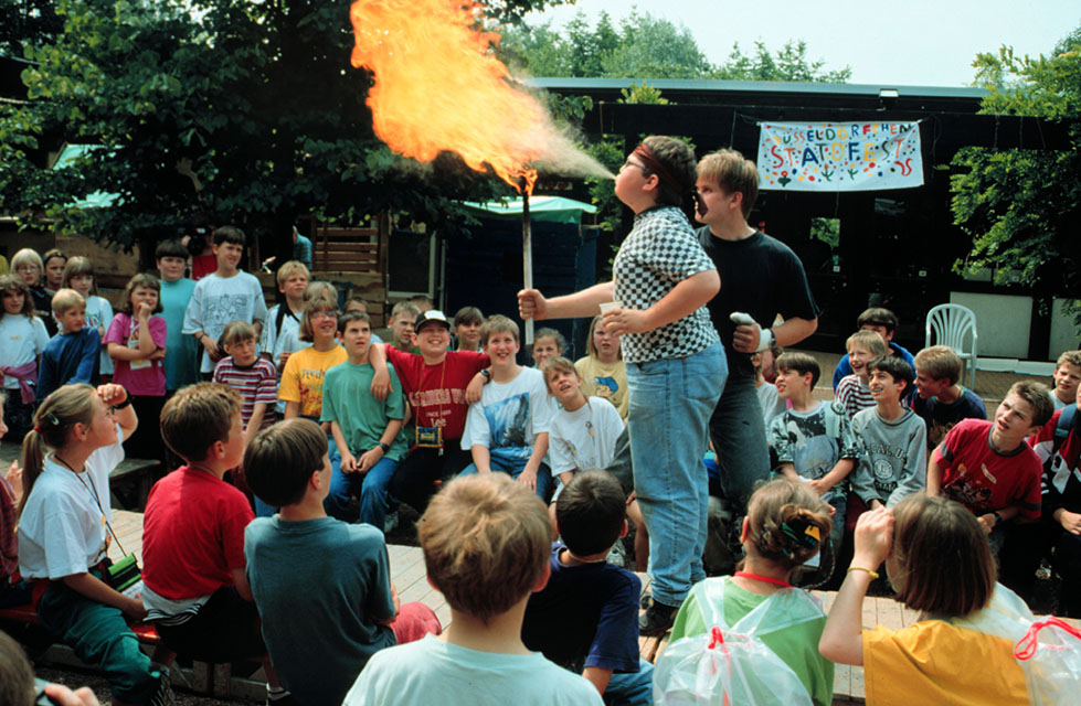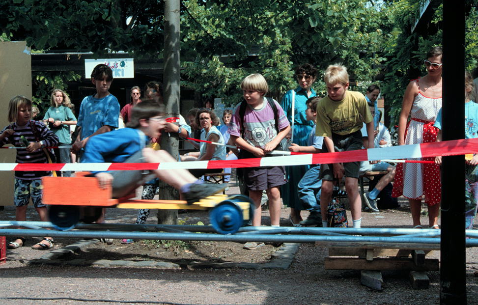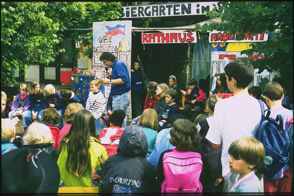 Das wohl bekannteste Ferien-Projekt von Akki startet 1989 mit 120 Kindern in Düsseldorf. Die Stadt der Kinder wechselt oft den Standort, etabliert sich aber bald im Südpark, zunächst noch am Akki-Haus, ab 2000 dann am heute bekannten Ort, der Megaplatte am anderen Ende des Südparks. Die Doku stammt aus dem Jahr 1990, die Kinderstadt fand bereits auf dem Gelände an der Siegburger Strasse statt, obwohl der Verein Akki erst zwei Jahre später hier einziehen sollte.