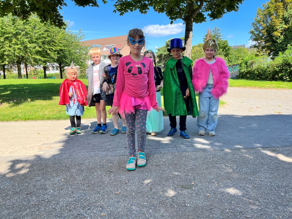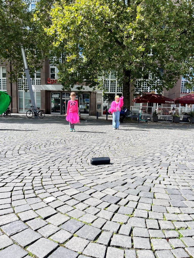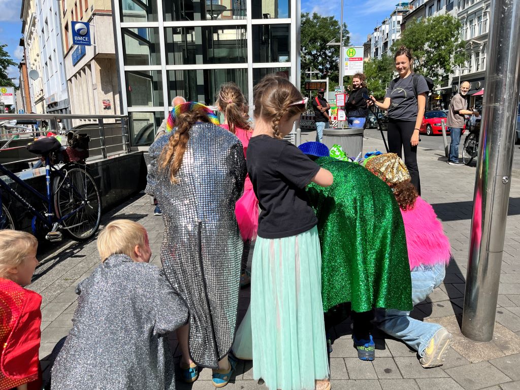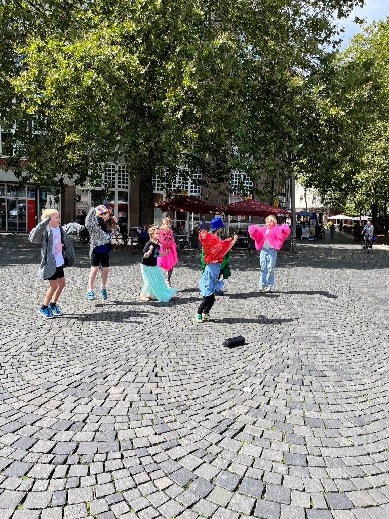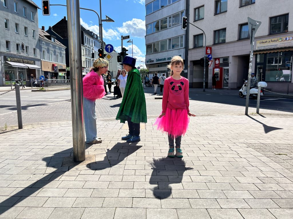Pantomimen gehören in ein trubeliges Stadtbild. Dabei brauchen sie keine realen Requisiten, sondern stellen alles mit dem Körper dar. Als verrückte Clowns zieht die Gruppe mit einer kleinen Szene durch den Stadtteil und die Kölner Strasse wird für sie zur größten Bühne Oberbilks.